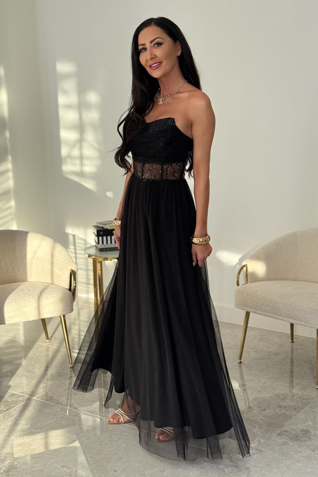 Dlhé čierne tylové šaty s flitrovaným korzetom 920/2