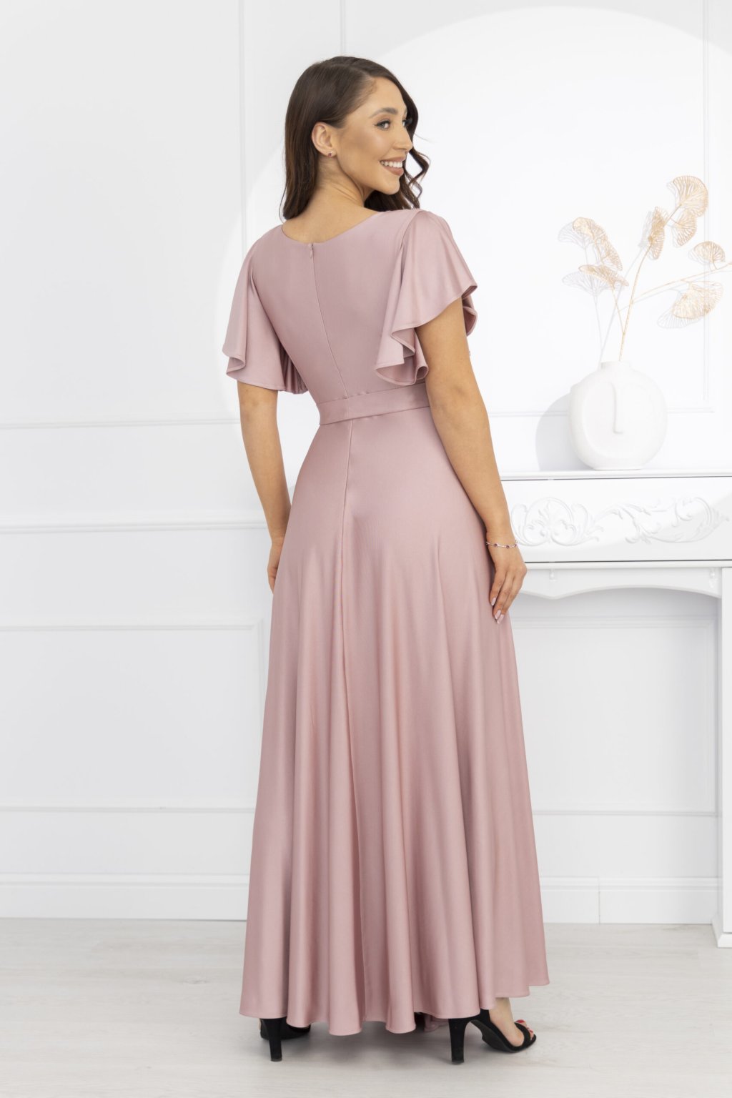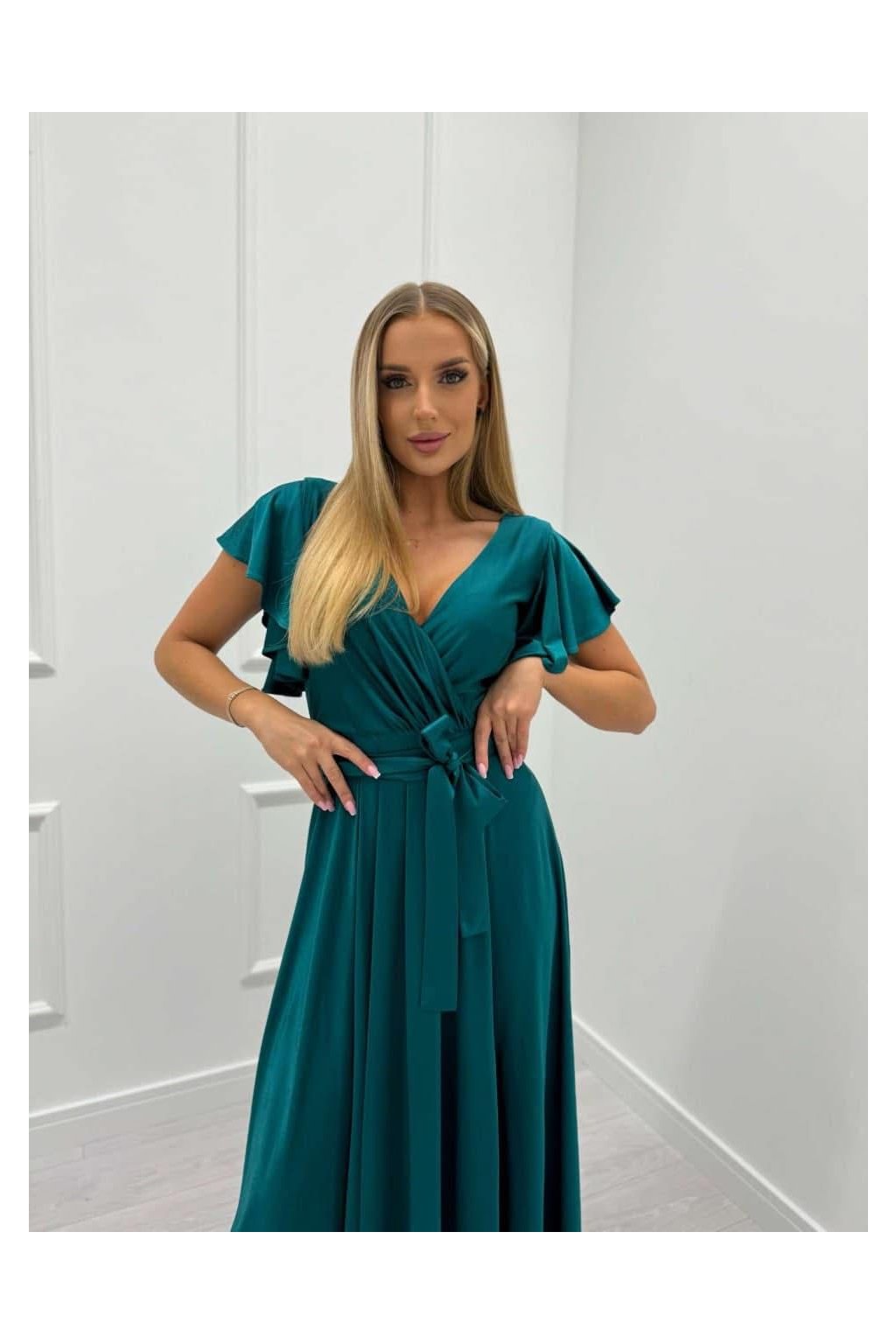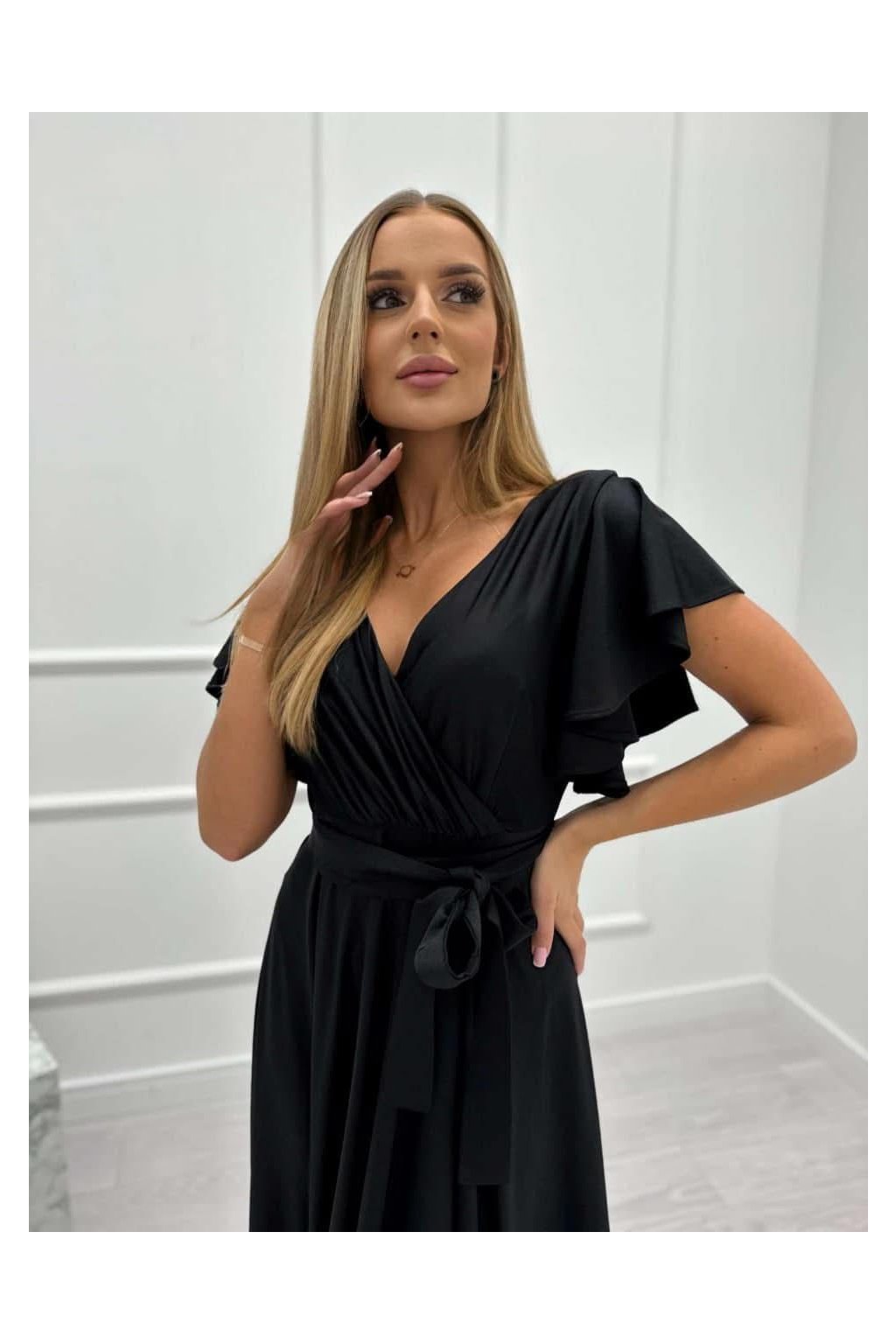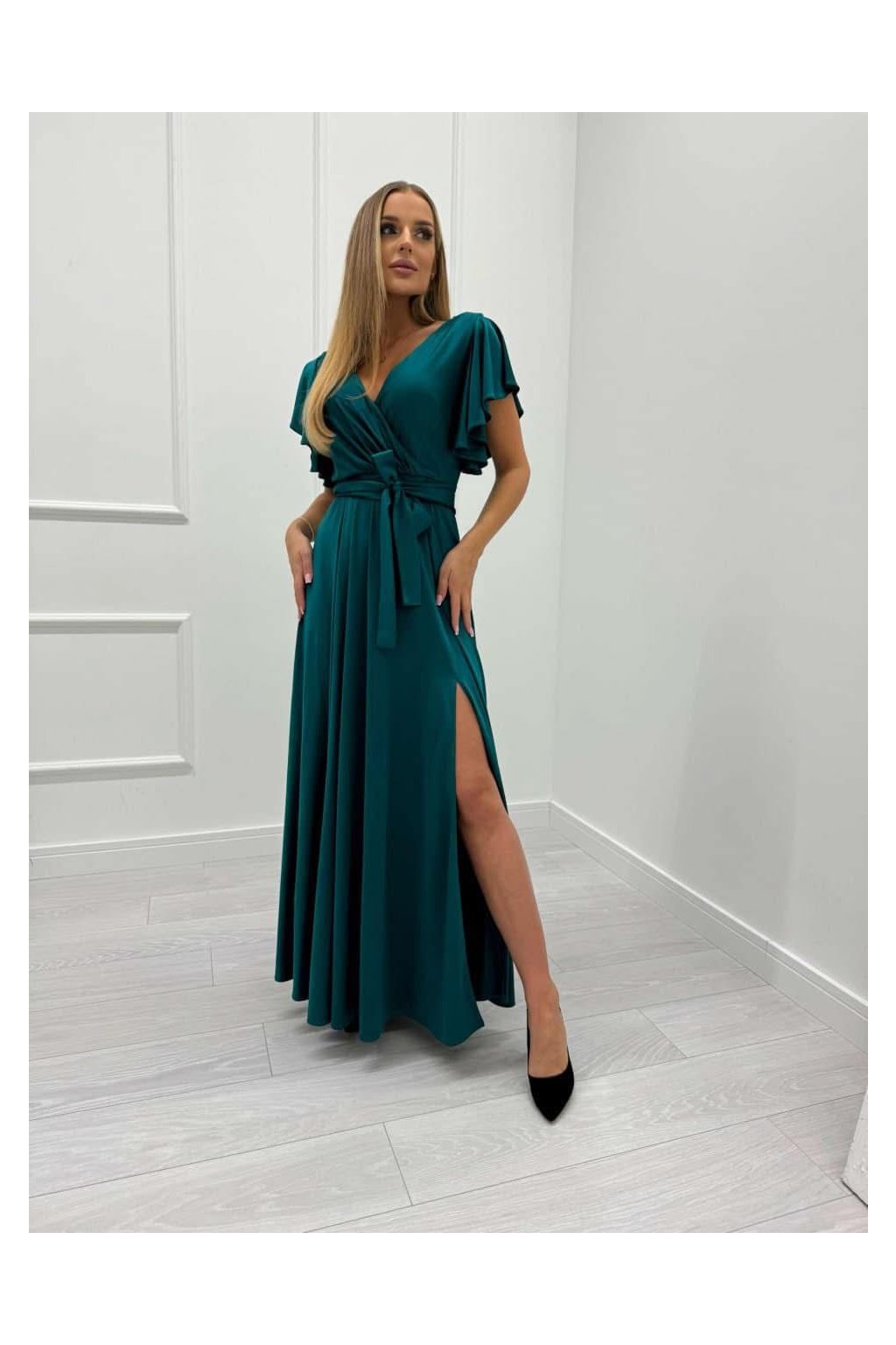 Šaty majú ženský výstrih do "V", jemné volánové rukávy a súčasťou šiat je odnímateľný opasok. Sú vyrobené z príjemného pružného materiálu, ktorý pôsobí luxusne. Navyše v páse je mierne pružná gumička, ktorá sa prispôsobí. Dlhá splývavá sukňa s rozparkom dodáva šatám zmyselnosť a voľnosť pohybu, ideálnu na spoločenské udalosti, svadby, večierky alebo romantickú večeru.