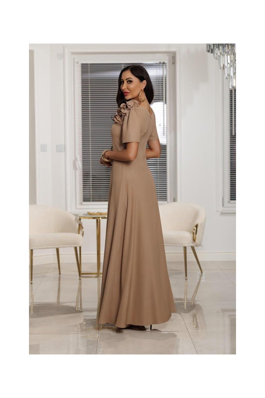 Tieto výnimočné dlhé šaty sú skvelou voľbou na svadbu či inú spoločenskú udalosť. Šaty sú z hladkej látky. Majú véčkový výstrih a nie sú na prsiach vystužené. Majú krátky rukáv. Sukňa je dlhá, padavá a na jednej strane má rázporok. Zapínajú sa zozadu na zips. Súčasťou šiat je odnímateľná kvetinová ozdoba a opasok.