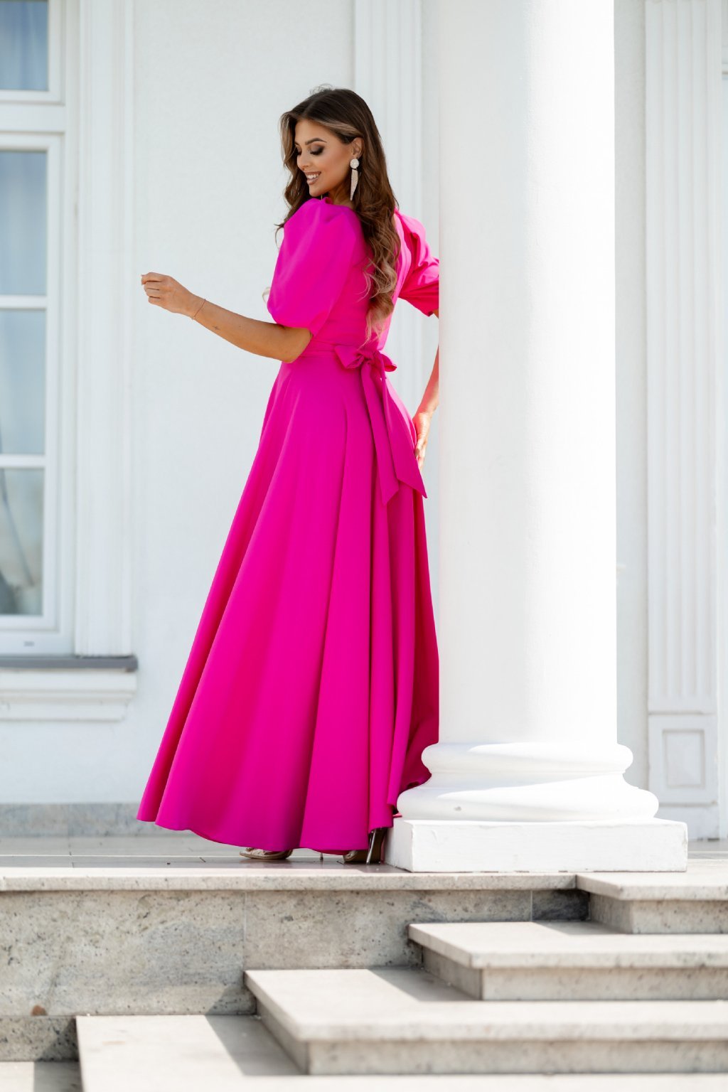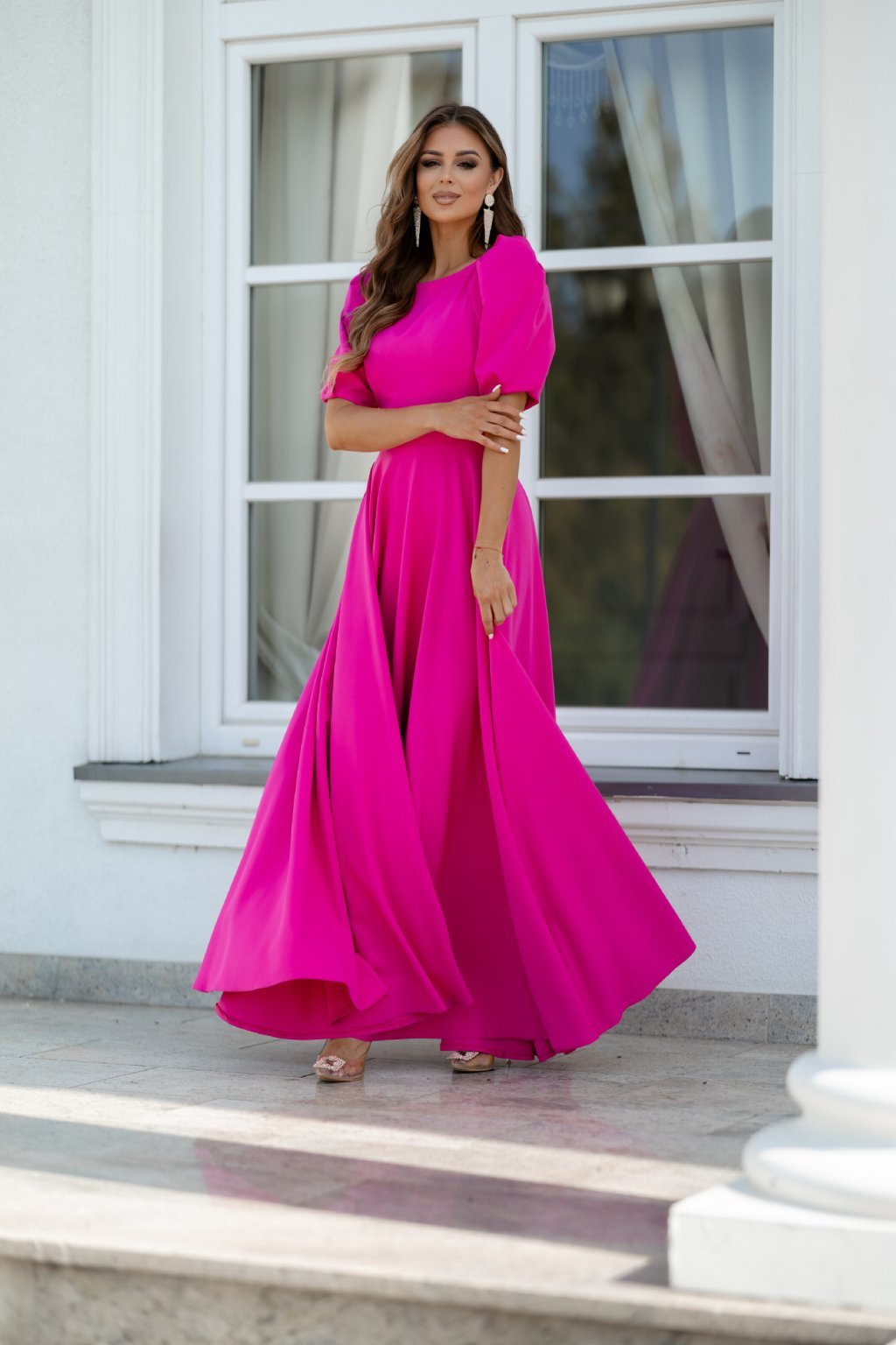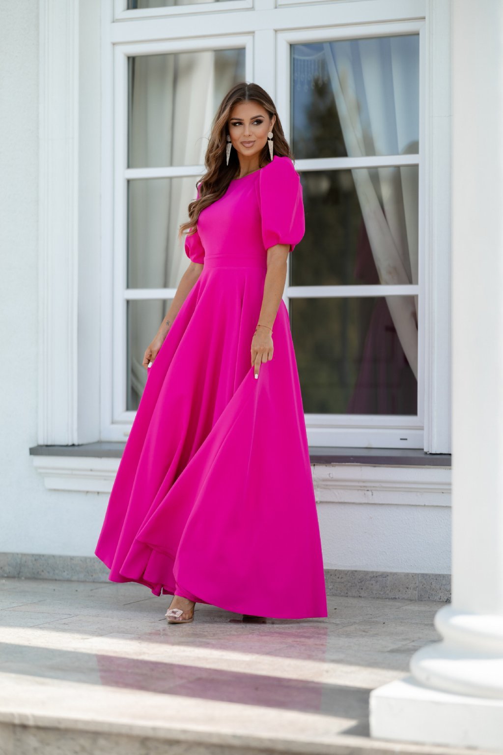 Dlhé ružovo-ostré spoločenské šaty s puff rukávmi 574/15