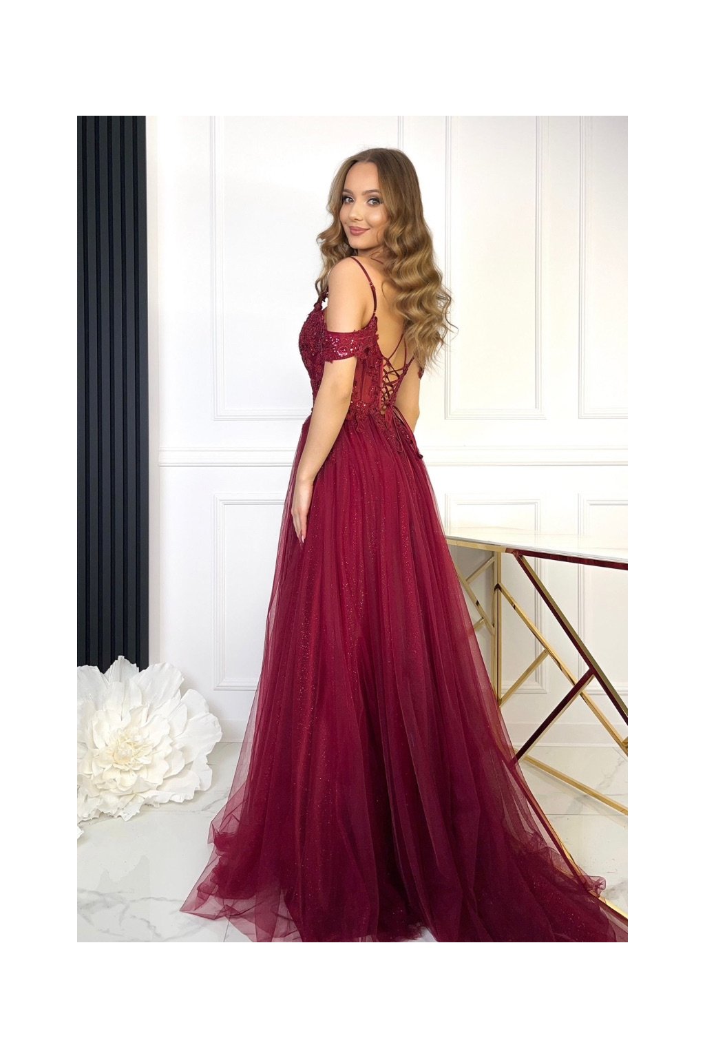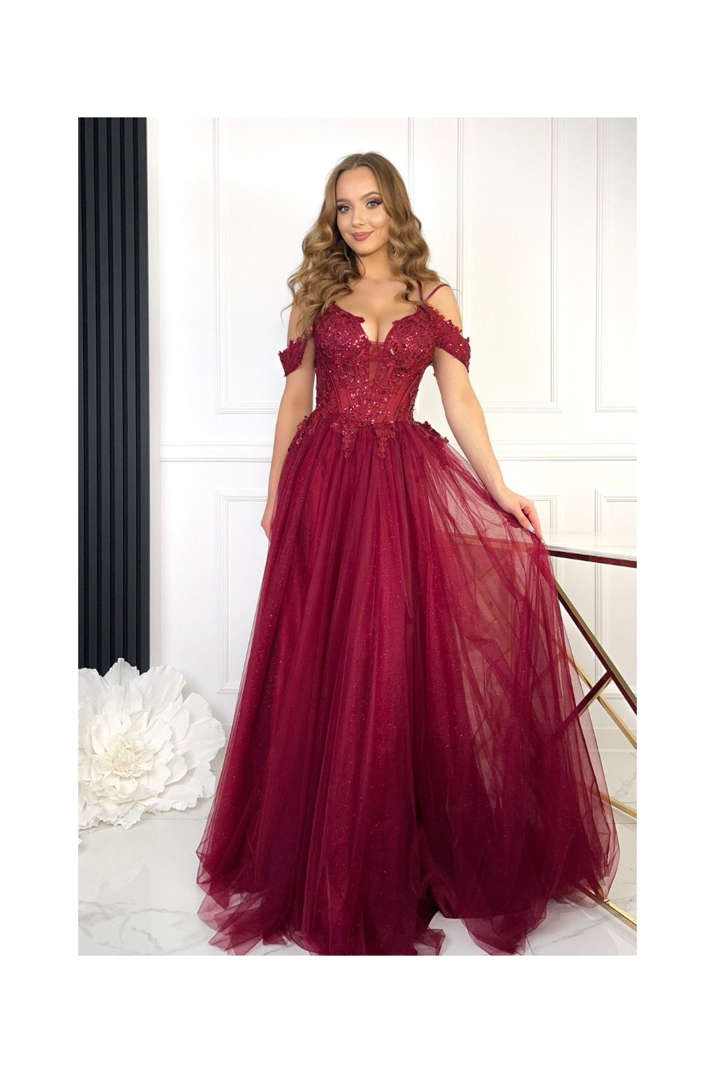 Tieto luxusné spoločenské šaty sú dokonalou voľbou na ples, svadbu, večierok alebo inú slávnostnú príležitosť. Romantický strih s odhalenými ramenami a tenkými ramienkami pôsobí veľmi žensky a elegantne.Živôtik je zdobený jemnou čipkou s flitrami a 3D kvietkami, ktoré šatám dodávajú jedinečný a detailne prepracovaný vzhľad. Áčková sukňa z ľahkého tylu s decentným trblietaním sa krásne vlní pri chôdzi a vytvára rozprávkový efekt.Na chrbte sa nachádza praktická šnurovačka, ktorá umožňuje prispôsobiť šaty rôznym typom postavy a zaručuje pohodlné nosenie aj perfektné padnutie.