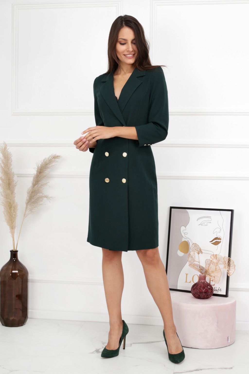 Elegantný kabátikový model je ideálnou voľbou pre ženy, ktoré chcú pôsobiť sebavedomo a štýlovo. Šaty sú navrhnuté v štýle predĺženého saka s dvojradovým zapínaním na výrazné zlaté gombíky, ktoré dodávajú modelu luxusný nádych.
