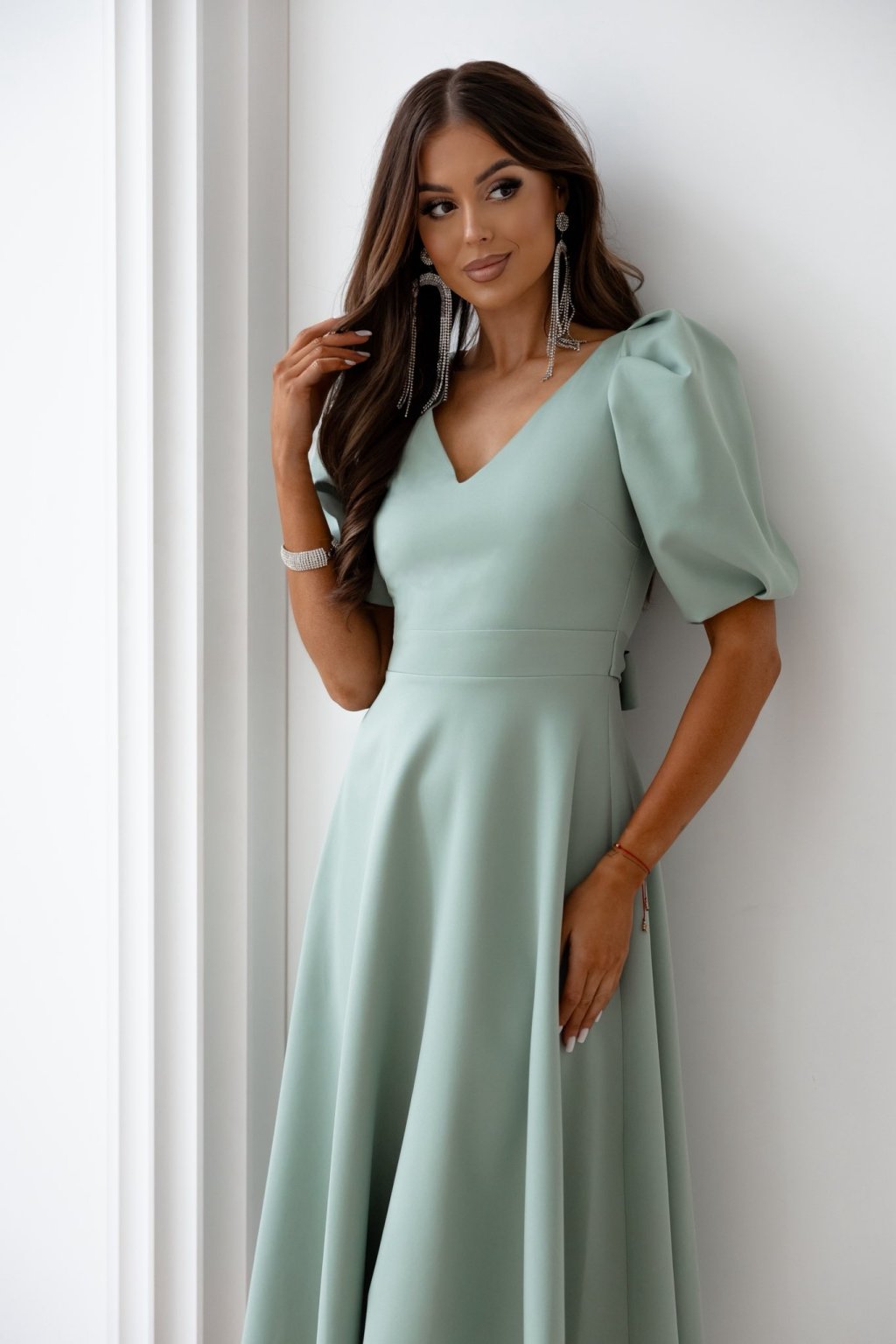 Spoločenské mentolové midi šaty. Na spoločenskej udalosti sa za Vami ponesie závan noblesy, elegancie a ženskosti. Vzadu sa šaty zapínajú zipsom.