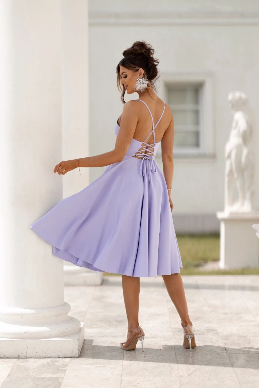 Tieto midi svetlofialové šaty sú stelesnením elegancie a sviežosti. Priliehavý vrch zvýrazní postavu, zatiaľ čo rozšírená sukňa dodáva modelu ženský a hravý vzhľad.