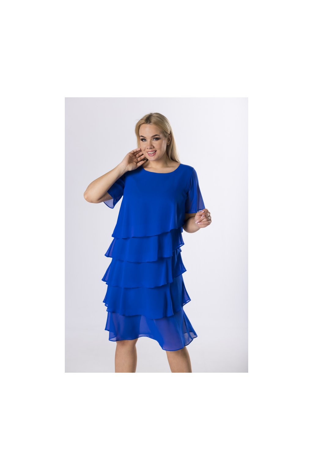 Pôsobivé šaty s krátkym rukávom zo vzdušného materiálu. Ľahkosť modelu dodávajú asymetrické volány, ktoré dokonale maskujú akékoľvek nedokonalosti postavy.  Elegantné šaty na rôzne príležitosti.