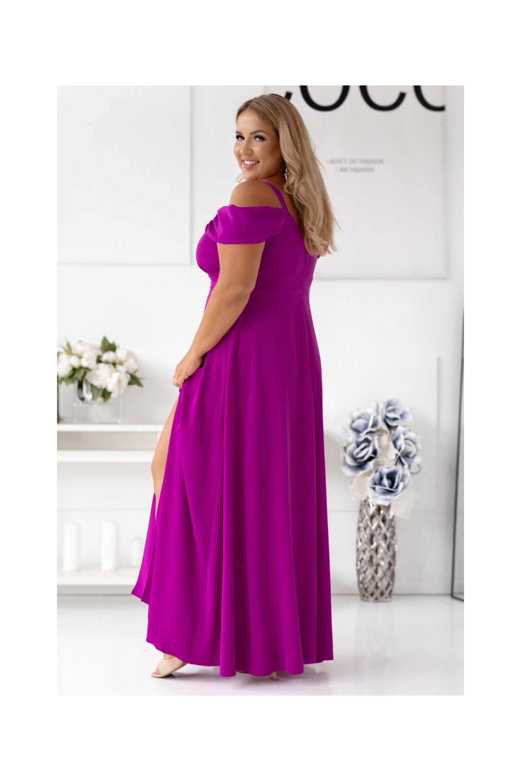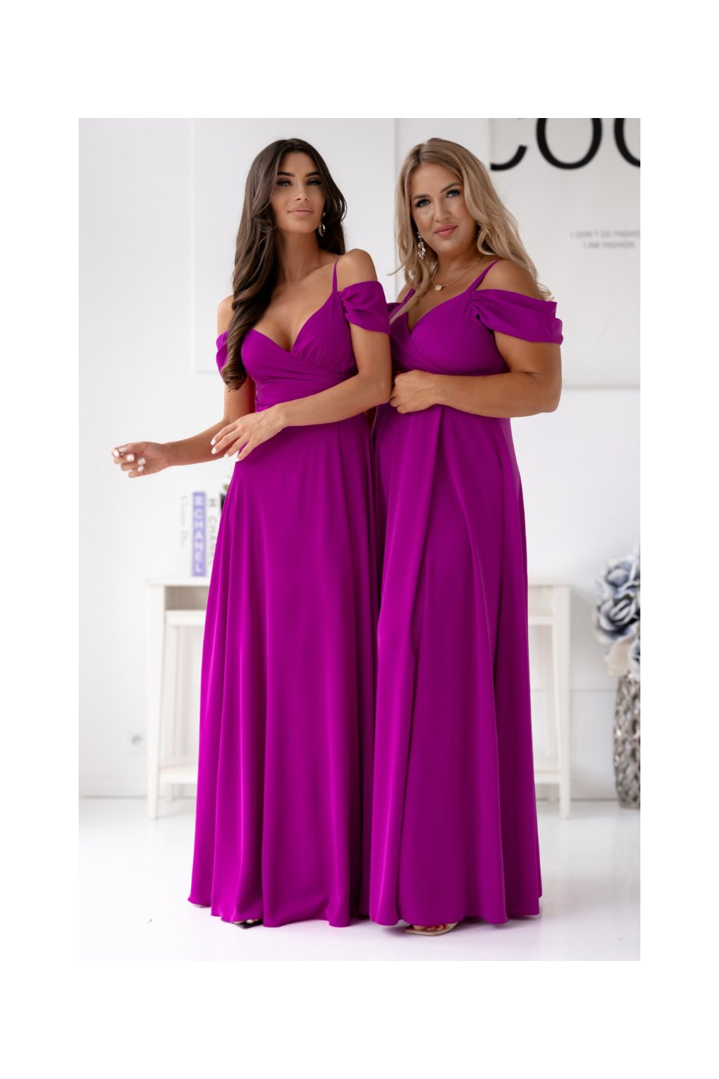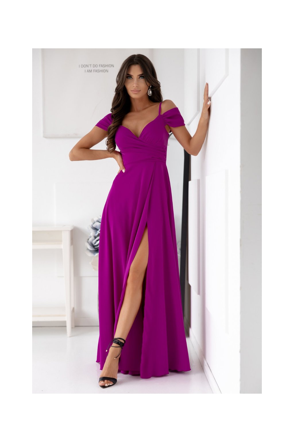 Elegantné maxi šaty so spadnutými ramienkami, nariaseným dekoltom a zvodným rozparkom. Vyrobené z jemného, splývavého materiálu so zapínaním na zips vzadu. Perfektná voľba na každú spoločenskú príležitosť.