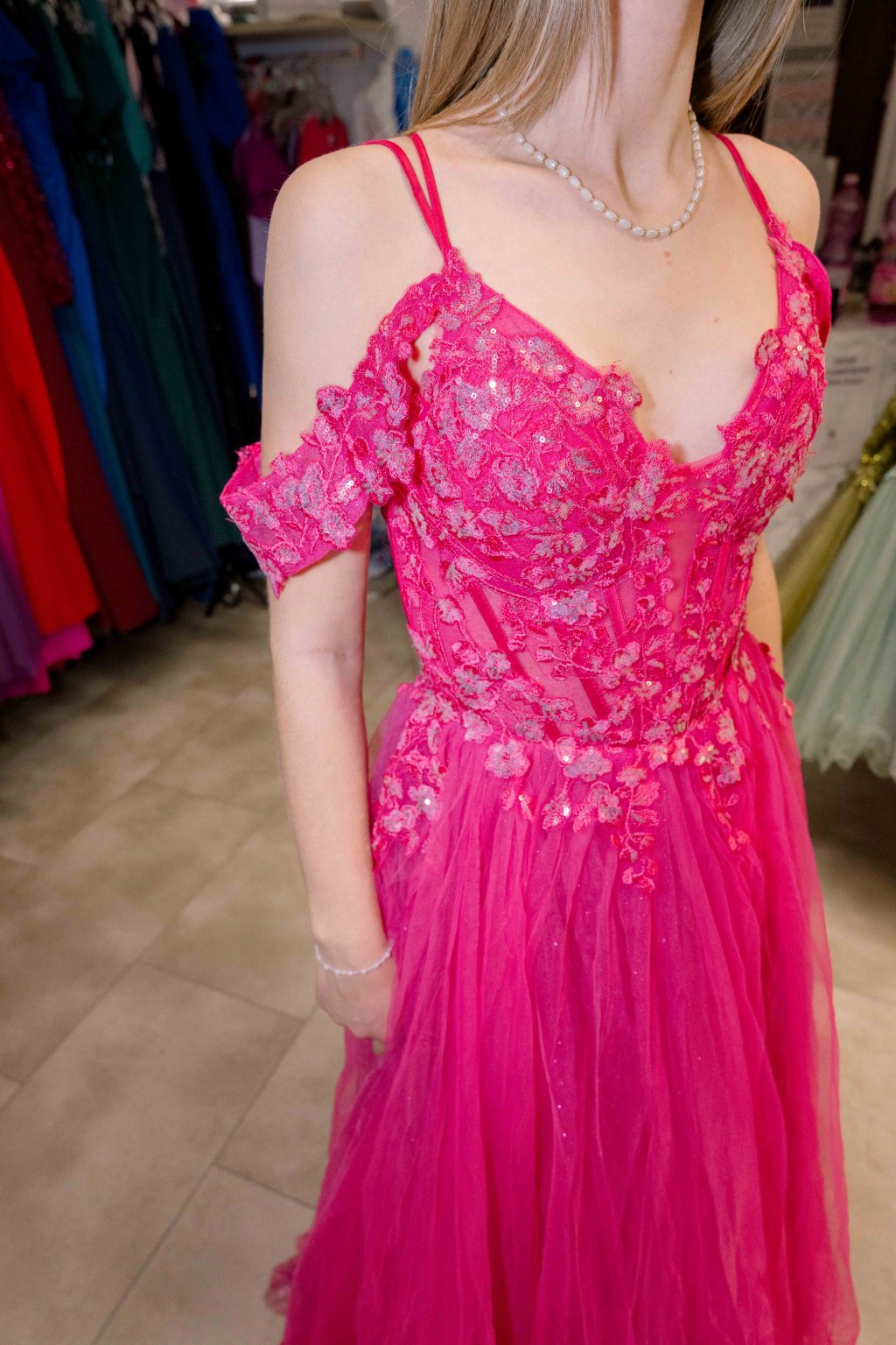 Tieto luxusné spoločenské šaty sú dokonalou voľbou na ples, svadbu, večierok alebo inú slávnostnú príležitosť. Romantický strih s odhalenými ramenami a tenkými ramienkami pôsobí veľmi žensky a elegantne.Živôtik je zdobený jemnou čipkou s flitrami a 3D kvietkami, ktoré šatám dodávajú jedinečný a detailne prepracovaný vzhľad. Áčková sukňa z ľahkého tylu s decentným trblietaním sa krásne vlní pri chôdzi a vytvára rozprávkový efekt.Na chrbte sa nachádza praktická šnurovačka, ktorá umožňuje prispôsobiť šaty rôznym typom postavy a zaručuje pohodlné nosenie aj perfektné padnutie.